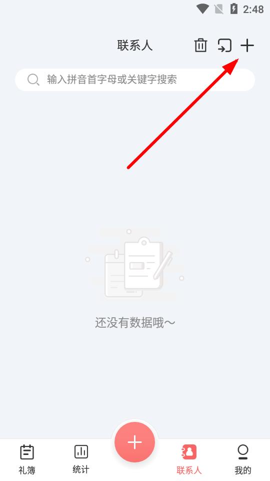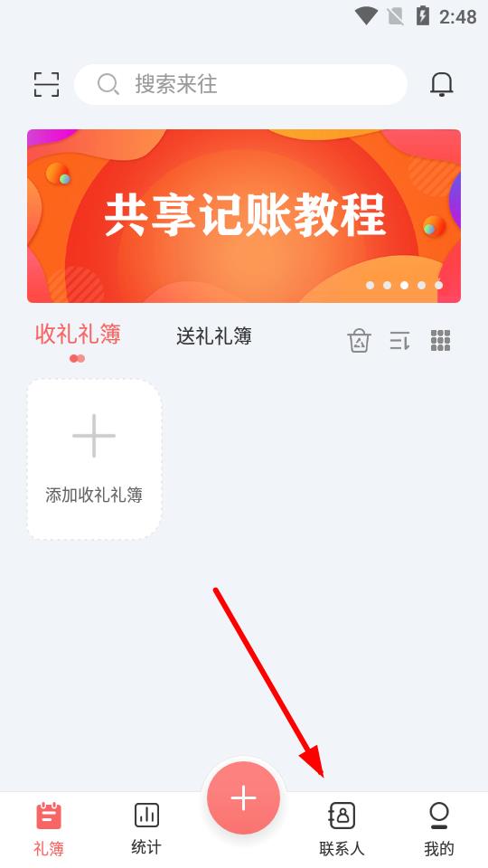 1、打开人情账簿应用,点击底部导航栏中的联系人按钮,进入联系人管理界面。
