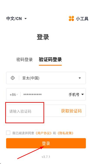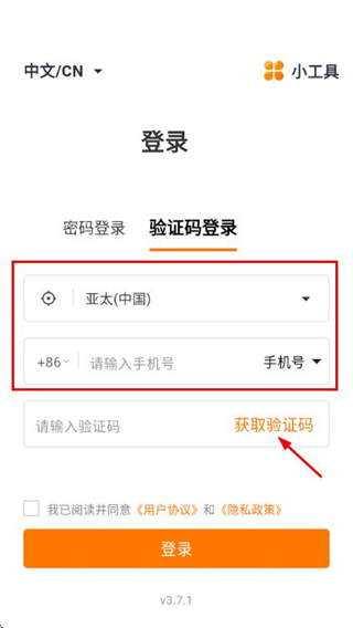2、在手机验证登录页面填写手机号,勾选协议后,点击获取验证码。