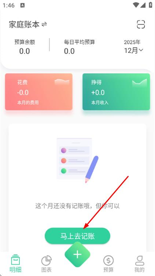 1、在家庭账本的明细页面点击马上去记账按钮,进入支出记账页面。