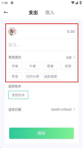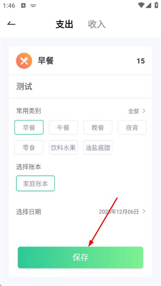3、在支出记账页面填好信息后,点击保存按钮,完成本次支出记账操作。