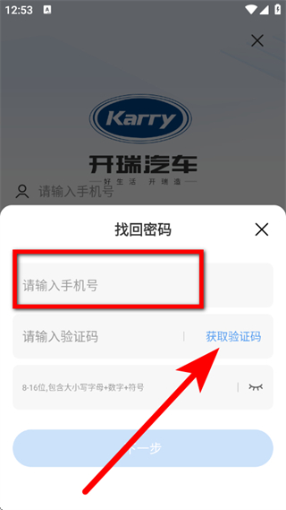 4、在找回密码页面,输入手机号,点击获取验证码。