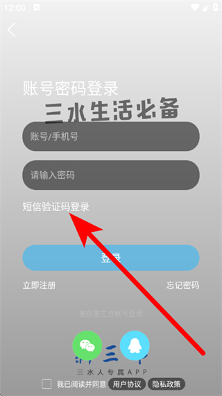 3、在登录页面,点击短信验证码登录,进入手机号填写界面。