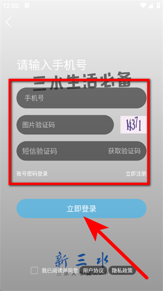 4、输入手机号、图片验证码,输入验证码,勾选协议并点击立即登录,完成登录操作。