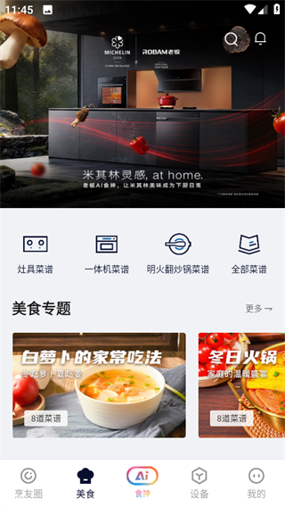 界面设计贴合烹饪使用场景,功能分区清晰明确,菜谱查找、厨电连接、互动分享等操作步骤简单,无需专业知识,不同年龄段用户都能快速上手驾驭。