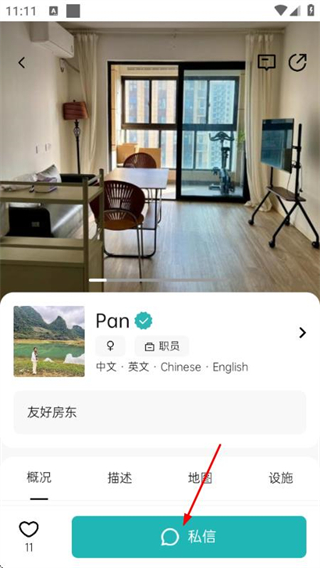 3、在房源详情页面点击私信按钮,与该房源的房东进行沟通。