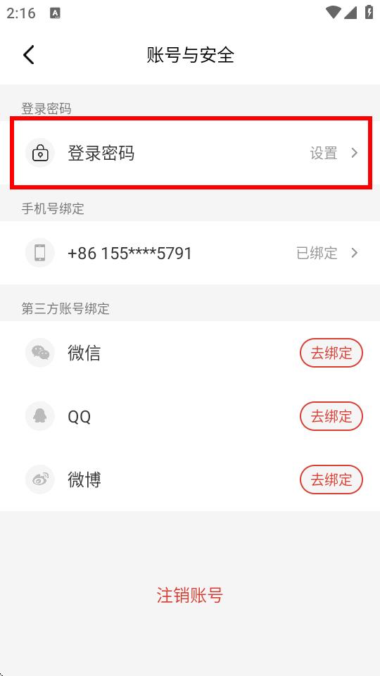 3、进入账号与安全页面后,点击登录密码。