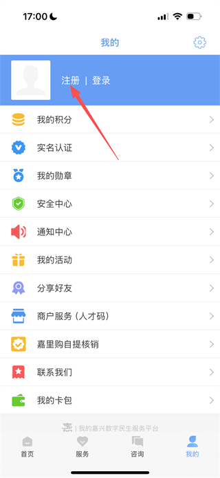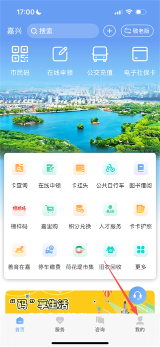 1、在我的嘉兴首页,点击底部的我的选项,进入个人中心页面。