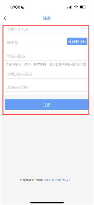 3、在注册页面,填写信息后,点击注册完成账号注册。