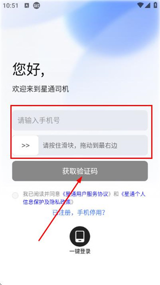 2、在手机验证登录页面填写手机号拖动滑块,勾选协议后,点击获取验证码。