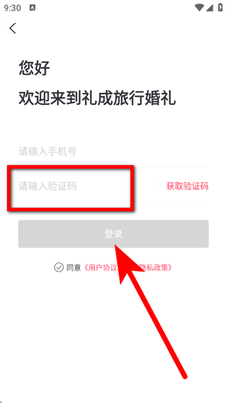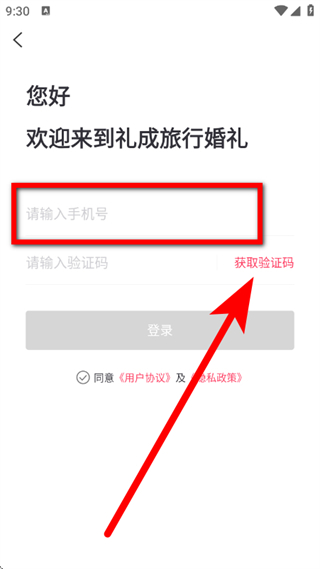 2、在登录界面,输入手机号码,点击获取验证码。