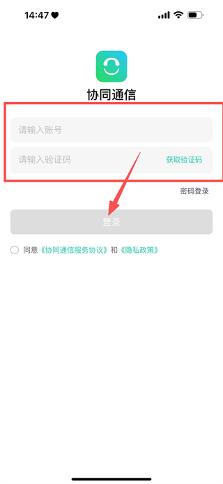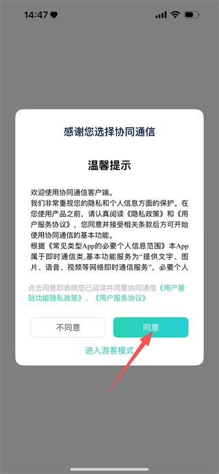 1、在协同通信的温馨提示弹窗,点击同意,进入登入页面。