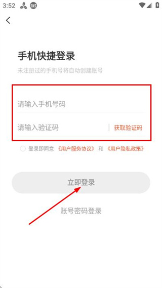3、在登录页面填写手机号和验证码,勾选协议后,点击立即登录完成账号登录操作。