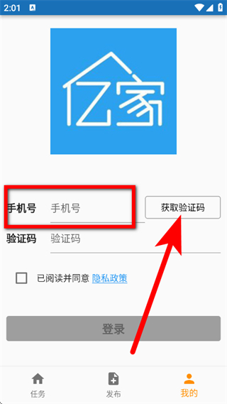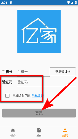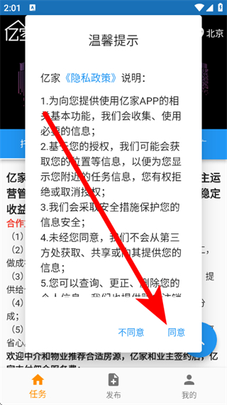 1、打开亿家,在弹出的隐私政策提示框中,点击同意。