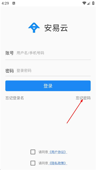 1、在安易云登录页,点击页面右侧的忘记密码的选项,进入重新设置密码的界面。