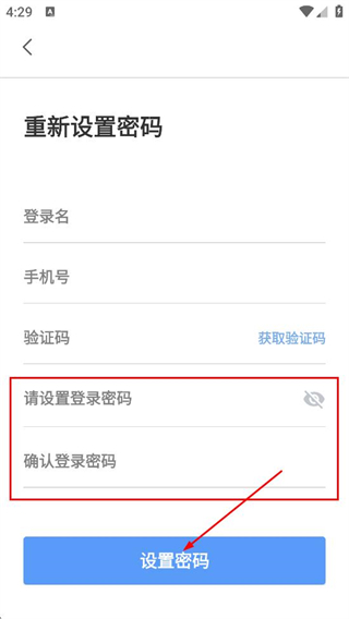 3、在重新设置密码页,填写请设置登录密码与确认登录密码,点击设置密码,完成密码重置。