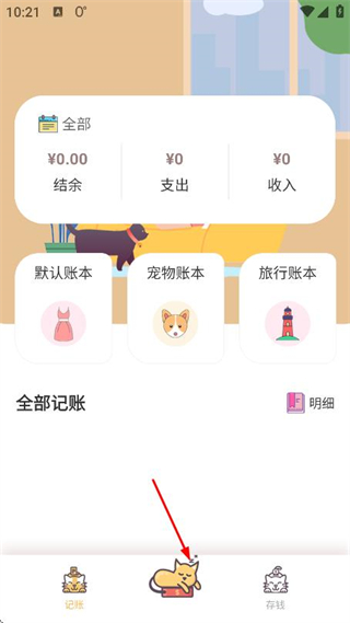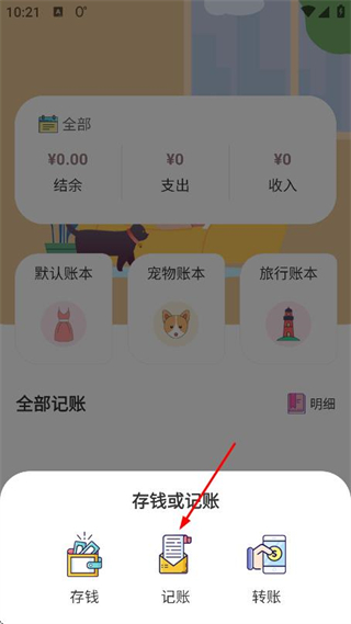 1、在记账应用首页点击底部中间的按钮,弹出存钱或记账选项菜单。