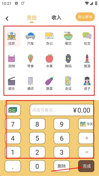 3、在记账页面选择支出分类、填写金额后,点击完成按钮完成本次记账操作。