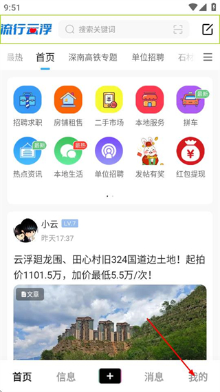 1、在流行云浮的首页,点击底部的我的选项,进入个人中心页面。