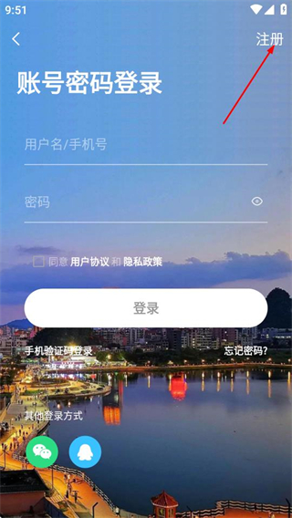 3、在账号密码登录页面,点击右上角的注册选项,进入注册新账号页面。