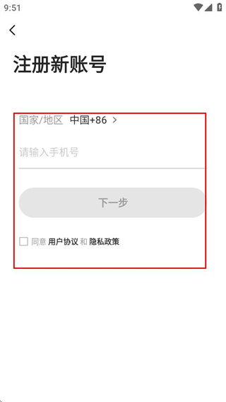 4、在注册新账号页面,选择地区、输入手机号并勾选协议后,点击下一步。