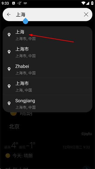 3、在搜索结果中点击目标选项,查看该城市的天气信息。