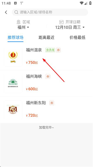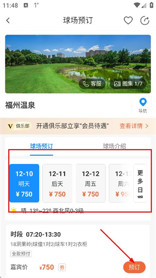 2、在订场页面点击目标球场,进入该球场的预订页面。