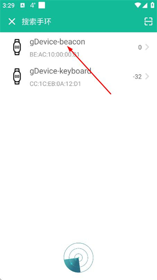 3、在搜索手环页面点击目标手环设备,进行设备绑定操作。