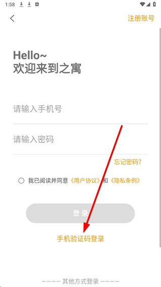 3、在登录界面,点击手机验证码登录选项,切换至验证码登录的信息填写界面。