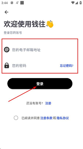 3、在登录页面填写邮箱和密码,勾选协议后,点击登录完成账号登录操作。