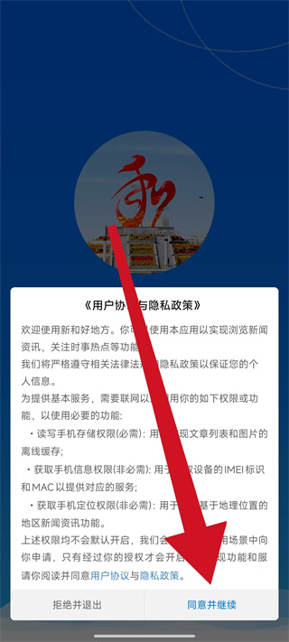 1、打开新疆好地方APP,在弹窗中点击同意并继续,进入应用首页。