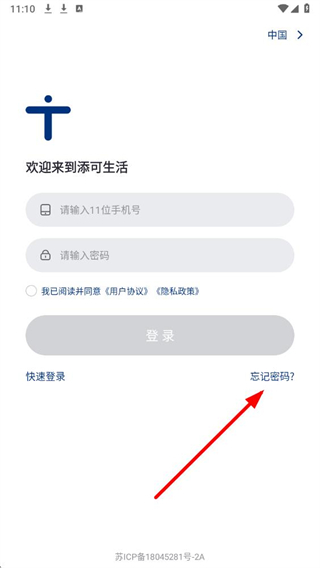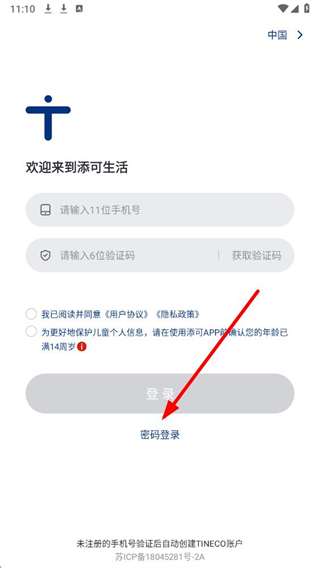 1、在添可生活应用的登录界面,点击密码登录选项,切换至密码登录的操作页面。