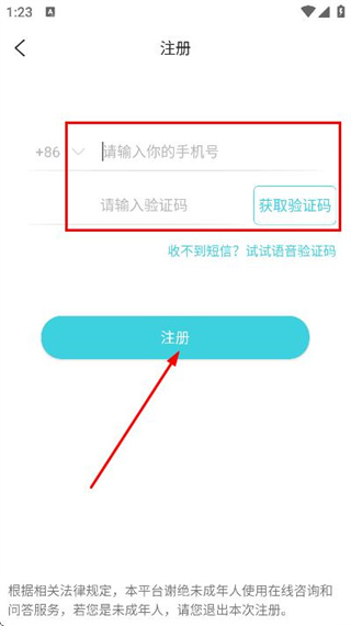 3、在注册账号页面填写手机号、验证码后,点击注册完成账号注册操作。