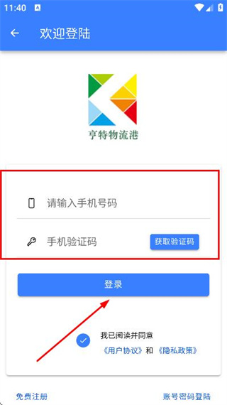 3、在登录页面填写手机号和验证码,勾选协议后,点击登录完成账号登录操作。