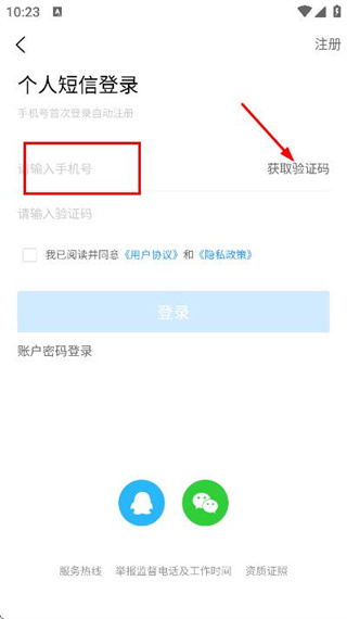 2、在手机登录页面填写手机号,勾选协议后,点击获取验证码。