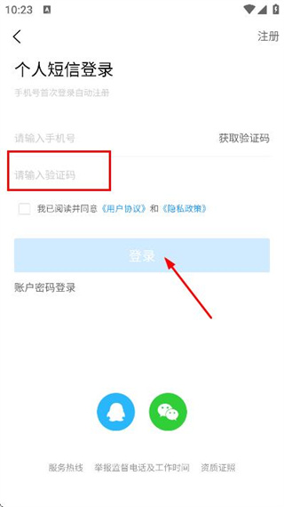 3、在验证码输入框中填写收到的验证码,点击登录完成账号的登录操作。