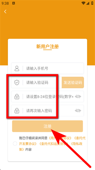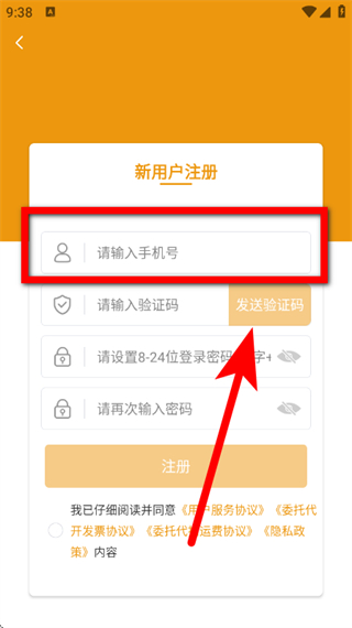 5、输入验证码,设置密码,勾选协议后,点击注册,完成注册。