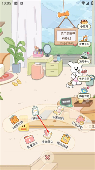 1、在心水收纳首页,点击底部的记物品选项,弹出物品录入方式菜单。