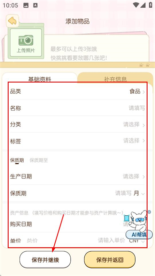 4、在添加物品页面,填写物品信息后点击保存并继续,完成物品录入。