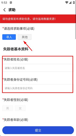 2、在求助页面选择求助事项,并填写失踪者基本资料。