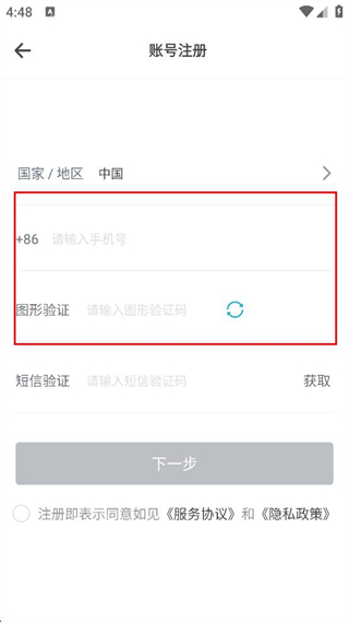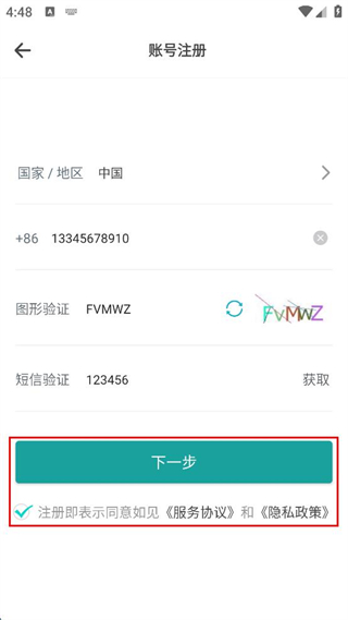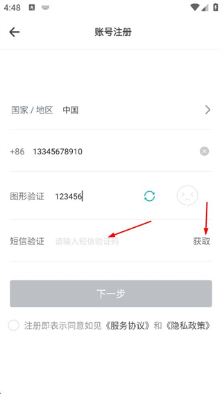 4、勾选注册即表示同意如见服务协议和隐私政策,点击下一步按钮。