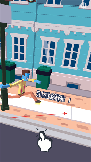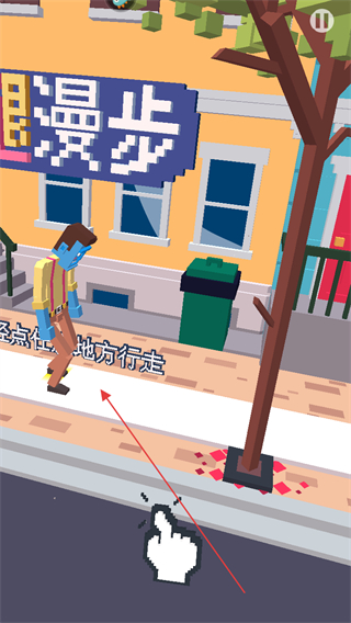 1、滑动操作控制角色在人行道行走,避开障碍如树木推进关卡。