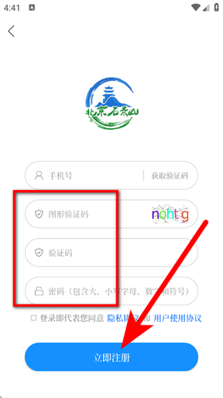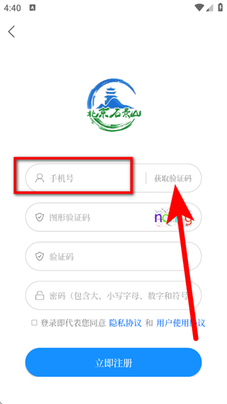 5、输入验证码并设置密码,勾选协议后,点击立即注册,完成北京石景山的注册操作。