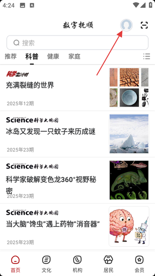 1、在数字抚顺的首页,点击右上角的头像图标,进入个人服务页面。