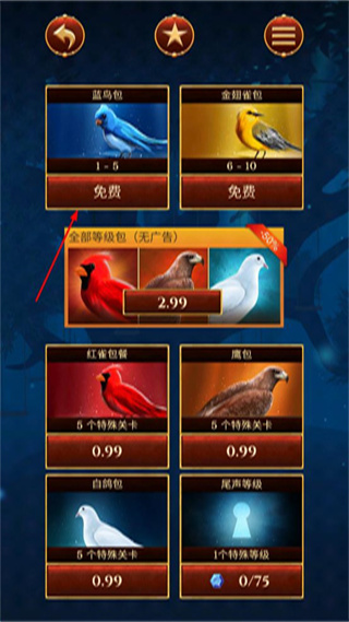 2、选择“蓝鸟包”对应的免费选项,进入该关卡包的游戏流程,准备开始解谜操作。