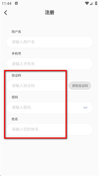 3、在注册页面,输入用户名与手机号,点击获取验证码。