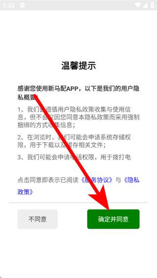 1、打开新马配车架号查询,在温馨提示弹窗中,点击确定并同意。