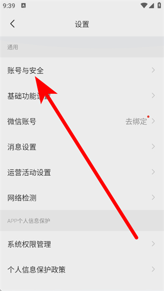 3、在设置页面,点击账号与安全,进入账号与安全页面。