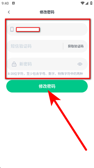 6、在手机验证页面,填写对应信息后,点击修改密码,完成密码修改操作。