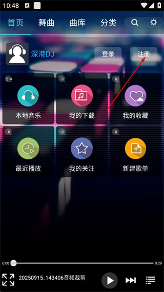 1、在该音乐APP首页,点击注册按钮,进入会员注册页面。
