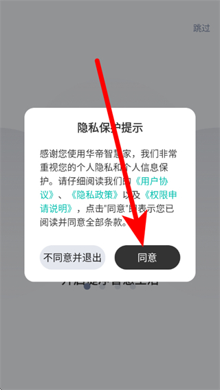 1、打开华帝智慧家,在隐私保护提示弹窗中,点击同意。